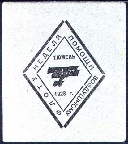 1923 1923 г. Разм. 68 х 71 мм. Одноцветная печать на серо-зеленой бумаге. В центре в двойной ромбовидной рамке разм. 46 х 59 мм самолет-биплан. Сверху текст: «Тюмень». Внизу дата: «1923 г.». Между рамками текст: «Неделя помощи воздушному флоту».