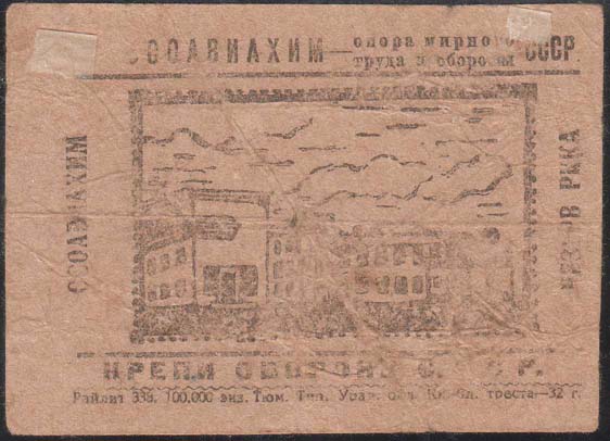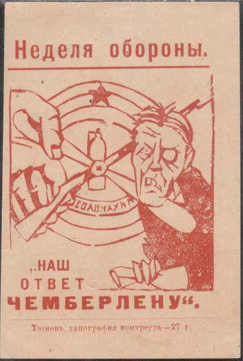 1927 1927 г. Разм. 60 х 87 мм. Одноцветная печать на желтоватой бумаге. В прямоугольной рамке разм. 50 х 54 мм аллегорический рисунок: на фоне значка Осоавиахима рука и голова Чемберлена, зажатая между винтовкой и пропеллером эмблемы. Сверху над рамкой текст: «Неделя обороны». Внизу под рамкой текст: ««Наш ответ Чемберлену»». Внизу под чертой выходные данные мелким шрифтом: «Тюмень, типография комтреста-27 г.».