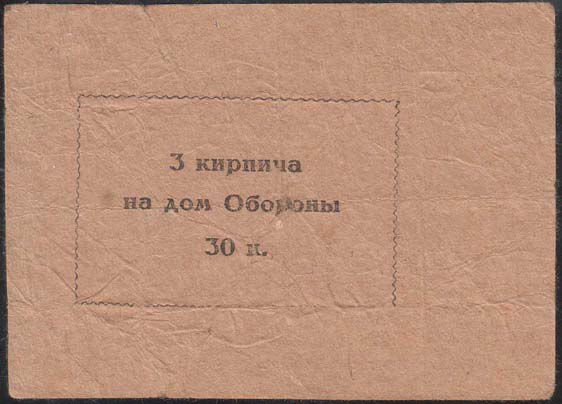 1932 1932 г. Разм. 93 х 66 мм. Одноцветная двухсторонняя печать на тонкой коричнево-оранжевой бумаге. На лицевой стороне в прямоугольной декоративной рамке здание Дома Обороны. По наружному периметру рамки текст: «ОСОАВИАХИМ – опора мирного труда и обороны СССР. ОСОАВИАХИМ резерв РККА. Крепи оборону С.С.С.Р.». Внизу под волнистой чертой мелким шрифтом выходные данные неразборчиво. На оборотной стороне в прямоугольной декоративной рамке разм. 55 х 36 мм текст в две строки: «3 кирпича на дом Обороны». Ниже номинал: «30 к.».