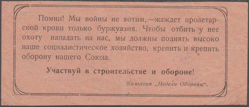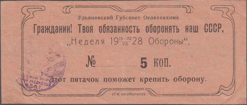 1928 1928 г. 15.-22.07.1928 г. Листок разм. 130 х 58 мм. Одноцветная двухсторонняя печать на желтовато-серой бумаге. На лицевой стороне в декоративной рамке текст в пять строк: «Ульяновский Губсовет Осоавиахима. Гражданин! Твоя обязанности оборонять наш СССР. «Неделя 15.-22./VII 1928 обороны». № ... 5 коп. Этот пятачок поможет крепить оборону». Внизу под рамкой мелким шрифтом текст: «(См. на обороте)». В левом нижнем углу фиолетовый оттиск круглой печати ОДВФ(?). На оборотной стороне в декоративной рамке текст в семь строк: «Помни! Мы войны не хотим – жаждет пролетарской крови только буржуазия. Чтобы отбить у нее охоту нападать на нас, мы должны поднять высоко наше социалистическое хозяйство, крепить и крепить оборону нашего Союза. Участвуй в строительстве и обороне! Комиссия «Недели обороны»».