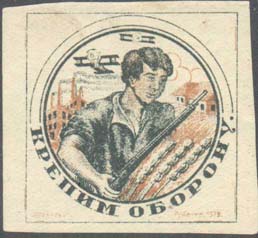 1930 1930(?) г. Разм. 40 х 40 мм. Одноцветная и двухцветная печать на плотной белой бумаге. В прямо-угольной рамке разм. 35 х 35 мм вписана круглая рамка. В круглой рамке в центре рабочий с винтовкой на фоне аграрно-индустриального пейзажа. Сверху два самолета-биплана. Под рамкой текст: «Крепи оборону». Внизу выходные данные мелким шрифтом: «Ульяновск. Гублит №1379».