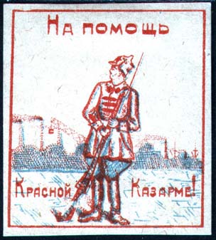 1926 1926 г. Разм. рамки 45 х 51 мм. Двухцветная печать на желтоватой бумаге. В прямоугольной рамке в центре красноармеец с винтовкой на фоне индустриального пейзажа. Сверху текст: «На помощь». Внизу продолжение текста: «Красной Казарме!».