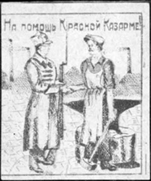 1926 1926 г. Разм. рамки 46 х 51 мм. Двухцветная печать на толстой желтоватой бумаге. Рабочий с молотом у наковальни и красноармеец с винтовкой пожимают друг другу руки на фоне завода. Сверху текст: «На помощь Красной Казарме!».