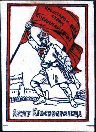 1924 1924(?) г. Разм. рамки 45 х 65 мм. Двухцветная печать на белой бумаге. В центре красноармеец со знаменем в правой руке и винтовкой в левой. На знамени текст в три строки: «Пролетарии всех стран, соединяйтесь!». На заднем плане изображение крепости. На одной из башен крепости флаг с текстом: «Капитал». Внизу текст: «Другу Красноармейца».