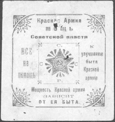 1925 1925 г. Разм. 54 х 54 мм. Одноцветная печать на тонкой желтоватой бумаге низкого качества. В прямоугольной декоративной рамке в цитре дополнительная прямоугольная рамка, в которой красная звезда с серпом и молотом и буквы аббревиатуры: «.С.C.С.Р.». По периметру между рамками текст: «Красная Армия мощь Советской власти. Мощь Красной армии зависит от ее быта. Все на помощь к улучшению быта Красной армии».