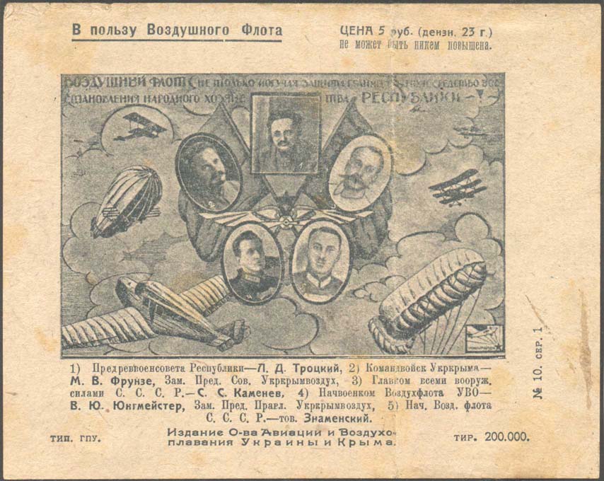 1923 1923 г. Листок размером 143 х 114 мм. Одноцветная печать на толстой желтоватой бумаге. В прямоугольной рамке разм. 106 х 68 мм на фоне скрещенных знамен эмблема Воздушного флота: крылья, пропеллер, звезда. Вокруг эмблемы самолеты различных типов, дирижабль, аэростат и пять портретов в рамках. В правом нижнем углу рисунок, аналогичный рисунку первых республиканских выпусках ОАВУК. Сверху текст в две строки: «Воздушный флот не только могучая защита границ, но и средство восстановления народного хозяйства республики!». Над рисунком текст: «В пользу воздушного флота». Правее текст в две строки: «Цена 5 руб. не может быть никем повышена». Под рисунком текст в пять строк: «1) Предреввоенсовета республики – Л.Д.Троцкий, 2) Командвойск Укркрыма – М.В.Фрунзе, Зам[еститель]. Пред[седателя]. Сов[ета]. Укркрымвоздух, 3) Главком всеми вооруж[енными] силами С.С.С.Р. – С.С.Каменев, 4) Начвоенком Воздухфлота УВО – В.Ю.Юнгмейстер, Зам[еститель] Пред[седателя]. Правл[ения]. Укркрымвоздух, 5) Нач[альник]. Возд[ушного]. Флота С.С.С.Р. – тов. Знаменский». Ниже выходные данные: «Тип. ГПУ Издание О-ва Авиации и Воздухоплавания Украины и Крыма. Тир.200.000. №10 сер.I».