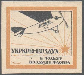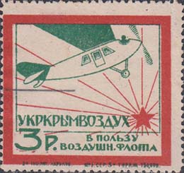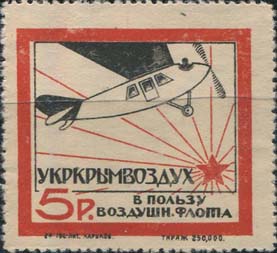 1923 1923 г. Первый республиканский выпуск. Разм. рамки 40 х 35 мм. Двухцветная печать на белой бумаге. Зубц. 11 1/2. С клеем. В двойной прямоугольной рамке в центре самолет-моноплан, летящий вправо. В правом нижнем углу пятиконечная звезда с лучами. Внизу в центре текст в три строки: «Укркрымвоздух в пользу Воздушн[ого]. Флота». Внизу под рамкой выходные данные мелким шрифтом.