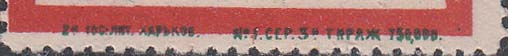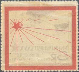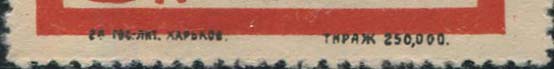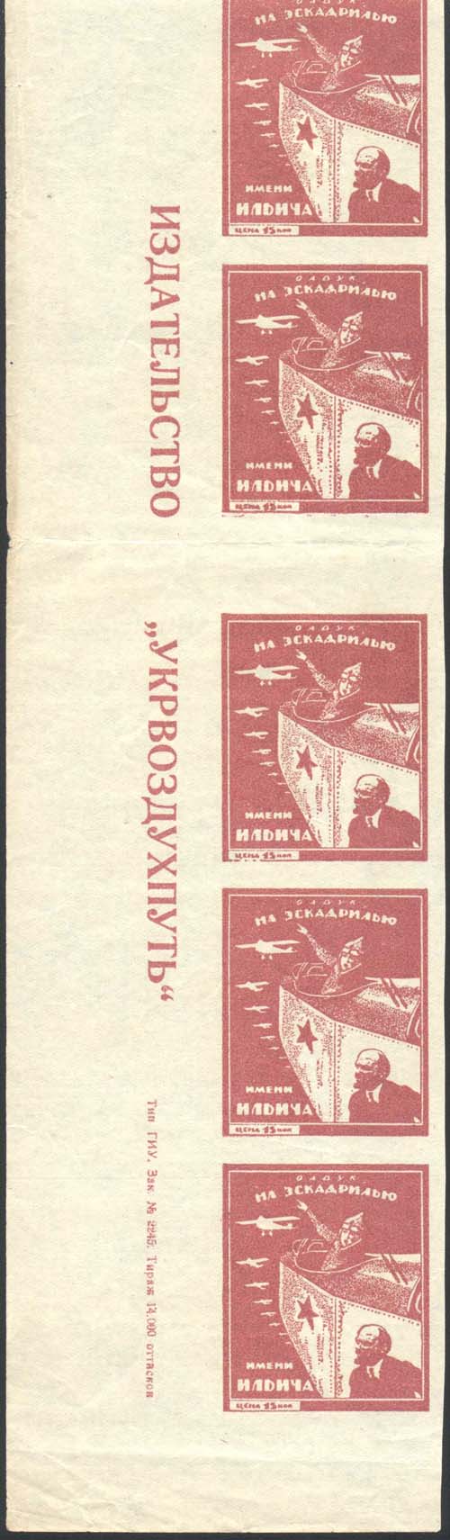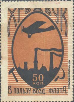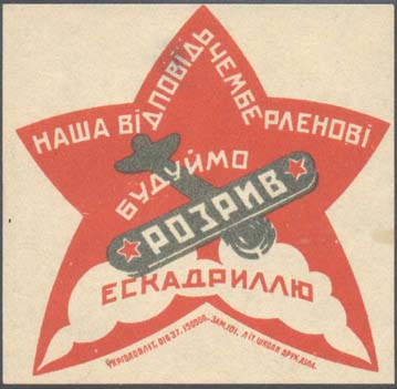 1927 1927(?) г. Разм. 59 х 58 мм. Двухцветная печать на белой бумаге. На фоне пятиконечной звезды самолет и текст в четыре строки на украинском языке: «Наш ответ Чемберлену. Строим эскадрилью «Раз-рыв»». Внизу мелким шрифтом выходные данные: «Укрглавлит 01637 150000 зак. 101. Лит. школа печатн. дела»