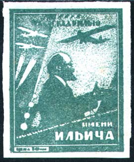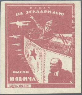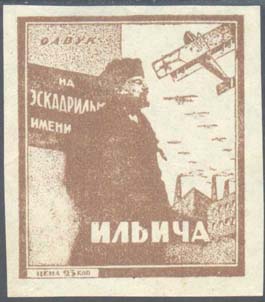 1924 1924 г. Разм. рамки 38 х 45 мм. Одноцветная печать на белой бумаге. Зубц. 11 1/2. И Б.З. В рамке различные рисунки. Текст: «ОАВУК на эскадрилью имени Ильича». В левом нижнем углу номинал.