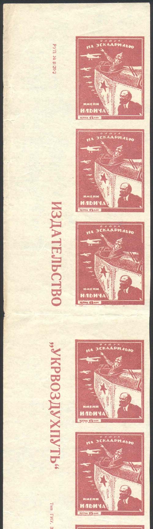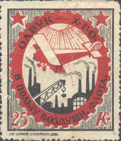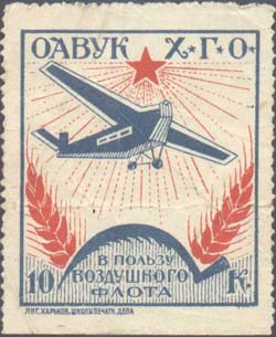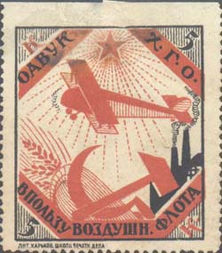 1924 1924 г. Двухцветная печать на белой бумаге. Зубц. 11 1/2. В прямоугольной рамке различные рисунки. Текст «ОАВУК Х.Г.О. В пользу воздушного флота». Под рамкой выходные данные: «Лит. Харьков. Школа печатного дела».