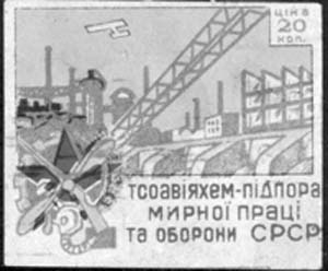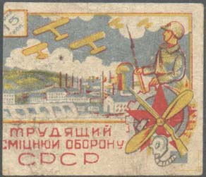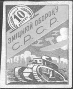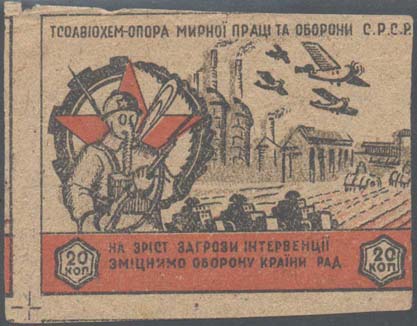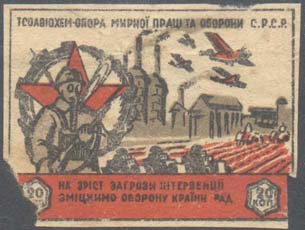 1927 1927(?) г. Разм. рамки 44 х 34 мм. Трехцветная печать на сероватой бумаге. В прямоугольной рамке красноармеец в противогазе, эмблема ОСОАВИАХИМ и три танка на фоне аграрно-индустриального пейзажа. Сверху четыре самолета. Сверху текст на украинском языке: «Осоавиахим - опора мирного труда и обороны СССР». Внизу текст на украинском языке в две строки: «В ответ на угрозу интервенции укрепляйте оборону Страны Советов». В нижних углах номинал в шестиугольных рамках.