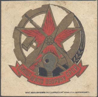 1929 1929 г. 21.09.1929 г. Разм. 55 х 55 мм. Трехцветная печать на желто-ватой бумаге. В центре эмблема ОСОАВИАХИМ. На ленте текст на украинском языке: «Крепи оборону СССР». Внизу мелким шрифтом выходные данные на украинском языке: «Окрлит 03212з. 634 1000000. трест Харполиграф Хромлит. Им. Дзержинского». Сбор в День обороны.