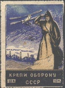 1930 1930 г. Разм. рамки 31,5 х 52 мм. Нерегулярная зубц. Трехцветная печать на желтоватой бумаге. В прямоугольной рамке в центре справа пограничник с винтовкой, слева городской пейзаж. В левом верхнем углу в небе самолет-биплан. Внизу текст в две строки: «Крепи оборону СССР. 10 копеек».