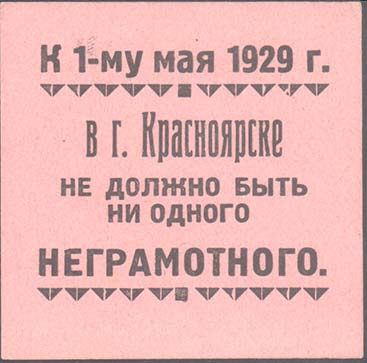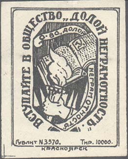 1924 1924(?) г. Разм 43 х 54 мм. Одноцветная печать на белой бумаге. В двойной прямоугольной рамке разм. 37 х 48 мм в центре семиугольная декоративная рамка. В рамке символы знаний: рука с факелом и раскрытая книга. На ленте текст: «О-во «Долой неграмотность»». По периметру декоративной рамки текст: «Вступайте в общество «Долой неграмотность»». Внизу над рамкой мелким шрифтом выходные данные: «Гублит №3570 Тир. 10000». Внизу под рамкой мелким шрифтом текст: «Красноярск».