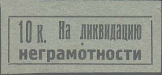 1929 1929 г. 01.05.1929 г. Разм. рамки 50 х 17 мм. Одноцветная печать на бумаге различных цветов. В центре в прямоугольной рамке текст в две строки: «На ликвидацию неграмотности». В левом верхнем углу номинал.