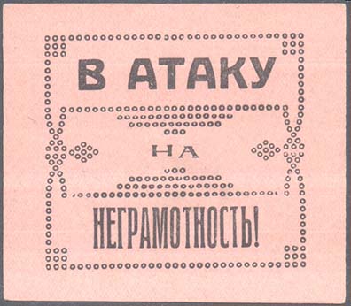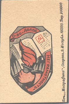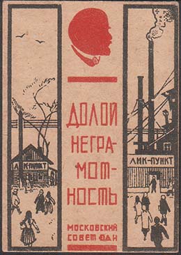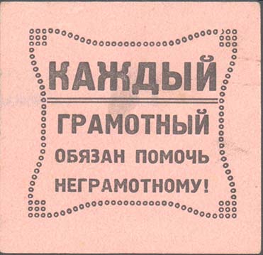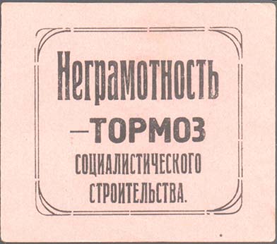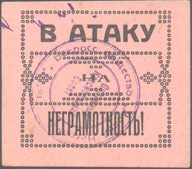 1930 1930 г. 01.11.1930 г. Разм. 43 х 61 мм. Двухцветная печать на толстой желтоватой бумаге. В центре сверху профиль В.И.Ленина. В центре текст в четыре строки: «Долой неграмотность». Внизу текст в две строки: «Московский совет ОДН». Слева в прямоугольной рамке лик-пункт в деревне. Справа в прямоугольной рамке лик-пункт в городе.