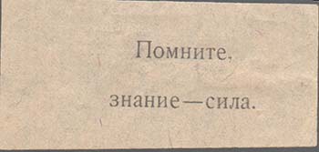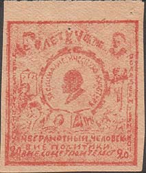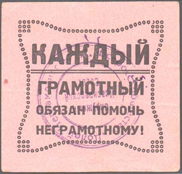 1932 1932(?) г. Разм. рамки 34 х 36 мм. Одноцветная печать низкого качества на желто-коричневой бумаге. В центре значок ОДН. Сверху по углам портреты партийных деятелей неразборчиво и текст: «XV лет Октяб[ря].». Внизу текст в три строки: «Неграмотный человек вне политики, вне соцстроительства». По бокам вертикально текст: «Через культуру овладеем техникой». Внизу по углам номинал.