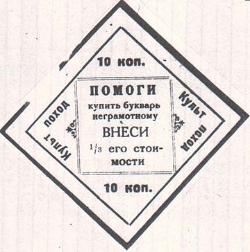 1928 1928 г. Ромб разм. 69 х 69 мм. Одноцветная печать на бумаге различных цветов. В рамке в форме ромба разм. 57 х 57 мм вписана двойня прямо-угольная рамка. В центре прямоугольной рамке текст в шесть строк: «Помоги купить букварь неграмотному. Внеси 1/3 его стоимости». По периметру между рамками дважды повторен тест: «Культпоход» и номинал.