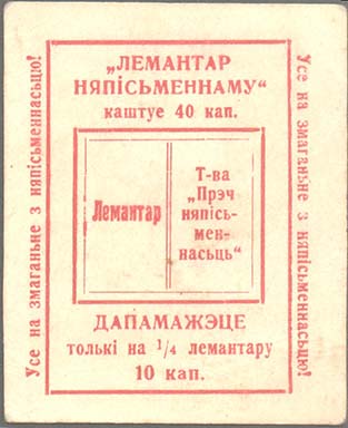 1931 1931 г. Разм. 49 х 68 мм. Одноцветная печать на желтоватой бумаге. В центре в прямоугольной рамке разм. 38 х 54 мм стилизованной изображение раскрытой книги, на развороте которой текст на белорусском языке: «Букварь. О-во долой неграмотность». Сверху текст в три строки на белорусском языке: «Букварь неграмотному стоит 40 коп.». Внизу текст в две строки: «Помогите только на 1/4 букваря». Внизу номинал. Слева и справа с наружной стороны рамки тексты на белорусском языке: «Все на борьбу с неграмотностью!».