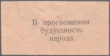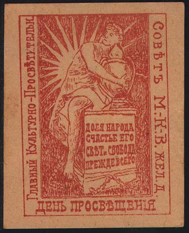 1917 1917(?) г. Разм. рамки 57 х 69 мм. Одноцветная печать на толстой желтоватой бумаге. В центре аллегорический рисунок. Текст в четыре строки: «Доля народа счастье его свет и свобода прежде всего». По периметру рамки текст: «Главный Культурно-Просветительн[ый]. Совет М.-К-.В. Жел. Д. День просвещения».