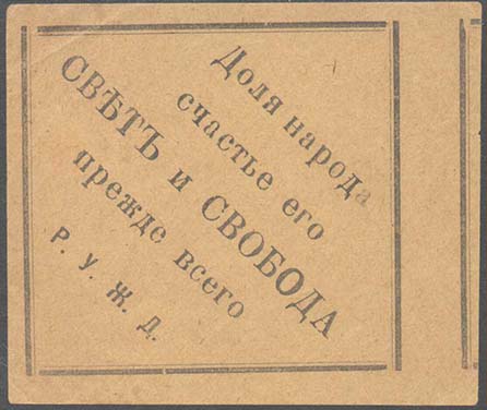 1917 1917 г. 24.09.1917 г. (24.09.1917 г.). Разм. рамки 58 х 54 мм. Одноцветная печать на бумаге различных цветов. В рамке текст в пять строк: «Доля народа счастье его свет и свобода прежде всего Р.У.Ж.Д.».