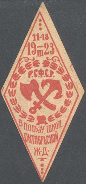 1923 1923 г. 11.-18.03.1923 г. Ромб разм. рамки 42 х 95 мм. Одноцветная печать на рыхлой желтоватой бумаге. В центре в обрамлении венка скрещенные топор и якорь. Сверху аббревиатура «Р.С.Ф.С.Р.». Сверху в две строки дата: «11-18 19-23/III». Внизу текст в две строки: «В пользу школ Октябрьской Ж.Д.».