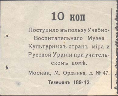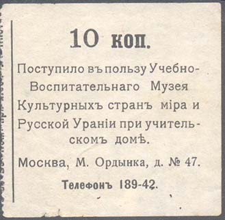 1912 1912(?) г. Листок из квитанционной книжки разм. 54 х 53 мм. Одноцветная печать на белой бумаге. Нерегулярная левосторонняя зубц. Сверху номинал. Ниже текст в семь строк: «Поступило в пользу Учебно-Воспитательнаго Музея Культурных стран мира и Русской Урании при учительском доме. Москва, М. Ордынка, д. №47. Телефон 189-42». Талон разм. 64 х 53 мм. Текст на талоне аналогичен тексту на квитанции.