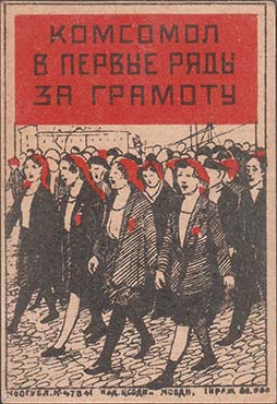 1930 1930(?) г. Разм. рамки 41 х 59 мм. Двухцветная печать на толстой желтоватой бумаге. В центре в прямоугольной рамке демонстрация на фоне городского пейзажа. Сверху текст в три строки: «Комсомол в первые ряды за грамоту». Внизу под рамкой мелким шрифтом выходные данные: «Мосгубл. №47841. Изд. ЦСОДН и МСОДН Тираж 80.000».