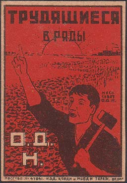 1930 1930(?) г. Разм. рамки 40,5 х 53 мм. Двухцветная печать на толстой желтоватой бумаге. В центре в прямоугольной рамке рабочий с поднятой вверх правой рукой и молотом в левой. На заднем фоне демонстрация на фоне завода и восходящего солнца. Сверху текст в четыре строки: «Трудящиеся в ряды О.Д.Н.». Внизу под рамкой мелким шрифтом выходные данные: «Мосгубл. №9841. Изд. ЦСОДН и МОСОДН Тираж 80 000».