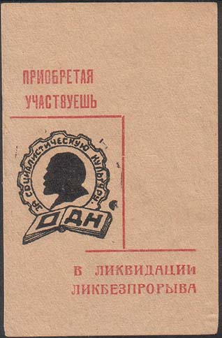 1931 1931(?) г. 01.01.1931 г. Разм. 52 х 80 мм. Двухцветная печать на желтоватой бумаге. В центре слева эмблема ОДН. Слева сверху текст в две строки: «Приобретая участвуешь». Справа внизу продолжение текста: «В ликвидации ликбезпрорыва».
