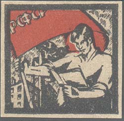 1925 1925(?) г. Разм. рамки 37 х 38 мм. Одноцветная печать на сероватой бумаге. В центре в прямоугольной рамке студент с книгой и красным флагом на фоне городского пейзажа.