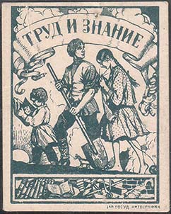 1925 1925(?) г. Разм. рамки 35,5 х 47 мм. Одноцветная печать на толстой белой глянцевой бумаге. В прямо-угольной рамке в центре на фоне лучей восходящего солнца юноша с лопатой, девушка с вязанием и мальчик с книгой. Сверху на ленте полукругом текст: «Труд и знание». Внизу книги и различные рабочие инструменты. Справа внизу под рамкой мелким шрифтом выходные данные: «1–ая Госуд. литография».