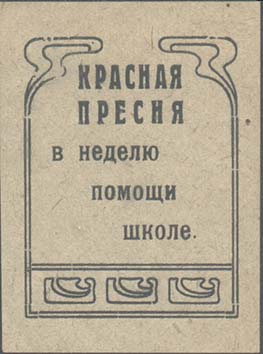 1930 1930(?) г. Разм. 44 х 59 мм. Одноцветная печать на серо-зеленой бумаге. В центре в фигурной рамке разм. 36 х 47 мм текст в пять строк: «Красная Пресня в неделю помощи школе».