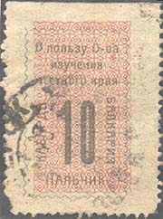 1925 1925(?) г. разм. по перфорации 29 х 39 мм. Одноцветная печать на кремовой бумаге. Зубц. 11 1/2. В центре на фоне в виде сетки номинал. Сверху текст в три строки: «В пользу О-ва изучения местного края». По периметру вокруг номинала тест: «Кабарда Балкария Нальчик».