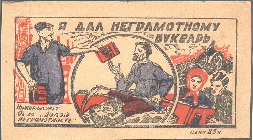1931 1931(?) г. Листок разм. 141 х 78 мм. Трехцветная печать на желтоватой бумаге. В прямоугольной рамке разм. 126 х 62 мм в центре рабочий протягивает крестьянину букварь. На заднем плане индустриальный и сельский пейзажи. В правом нижнем углу мужчина и женщина читают букварь. Сверху текст в две строки: «Я дал неграмотному букварь». В левом нижнем углу текст в три строки: «Нижкрайсовет Об-во «Долой неграмотность»». Справа внизу под рамкой текст: «Цена 25 к.».