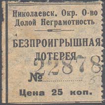 1930 1930(?) г. Разм. по перфорации 35 х 35 мм. Одноцветная печать на тонкой серой бумаге. Правосторонняя нерегулярная зубц. В центре текст в три строки: «Безпроигрышная лотерея №... (номер нумератором)». Сверху текст в две строки: «Николаевск[ое]. Окр[ужное]. О-во Долой Неграмотность». Внизу номинал: «Цена 25 коп.».