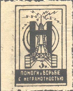 1929 1929 г. Разм. рамки 30 х 48 мм. Одноцветная печать на бумаге различных цветов. Зубц. 11 1/2. В двойной прямоугольной рамке стилизованная аббревиатура «ОДН». Буква «Д» в виде радиомачты. Ниже номинал. Внизу текст в две строки: «Помоги в борьбе с неграмотностью».