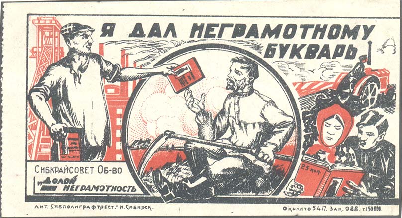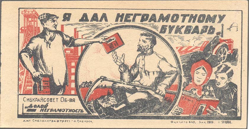 1931 1931 г. Листок разм. 141 х 73 мм. Двухцветная печать на плотной желтоватой бумаге. В прямоугольной рамке разм. 127 х 63 мм в центре рабочий протягивает крестьянину букварь. На заднем плане индустриальный и сельский пейзажи. В правом нижнем углу мужчина и женщина читают букварь. Сверху текст в две строки: «Я дал неграмотному букварь». В левом нижнем углу текст в три строки: «Сибкрайсовет Об-во «Долой неграмотность»». Внизу под рамкой мелким шрифтом выходные данные: «Лит. Сибполиграфтрест Н. Сибирск. Окрлито 645. зак. 2819 т. 50000».