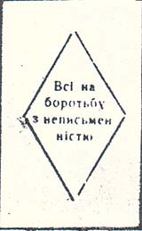 1932 1932(?) г. Разм. 38 х 62 мм. Одноцветная печать на белой бумаге. В центре в рамке в форме ромба разм. 28 х 49 мм текст в четыре строки на украинском языке: «Все на борьбу с неграмотностью».
