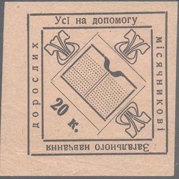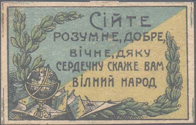 1918 1918(?) г. Разм. рамки 61 х 39 мм. Многоцветная печать на желтоватой бумаге. Поле в прямоугольной рамке по диагонали поделено на две части цветов украинского флага. В обрамлении венка из лавровых листьев в левом нижнем углу глобус и книги. Справа текст на украинском языке в пять строк: «Сейте разумное, доброе, вечное, спасибо сердечное скажет вам вольный народ».