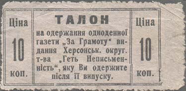 1930 1930 г. Разм. рамки 54 х 26 мм. Одноцветная печать на тонкой серо-зеленой бумаге. Нерегулярная зубц. В двойной прямоугольной рамке в центре текст в семь строк: «Талон на получение однодневной газеты «За Грамоту» выпуска Херсонск[ого]. Окружн[ого]. О-ва «Долой неграмотность», которую Вы получите после ее выпуска». Слева и справа номинал.