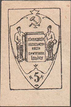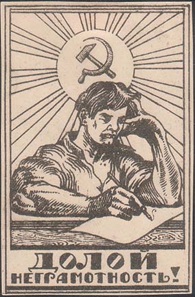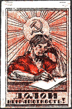 1925 1925(?) г. Разм. рамки 45 х 71 мм. Одноцветная и двухцветная печать на белой бумаге. В центре в двойной прямоугольной рамке рабочий, пишущий на листе бумаги, сидя за столом на фоне лучей восходящего солнца. На солнце в центре серп и молот. Внизу текст в две строки: «Долой неграмотность!».