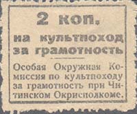 1930 1930(?) г. Разм. рамки 29 х 24 мм. Одноцветная печать на кремовой бумаге. Зубц. 11 1/2. В прямоугольной рамке сверху текст в три строки: «2 коп. на культпоход за грамотность». Внизу текст в четыре строки: «Особая Окружная Комиссия по культпоходу за грамотность при Читинском Окрисполкоме».