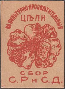 1918 1918 г. Разм. 36 х 49 мм. Одноцветная печать на плотной желтоватой бумаге. В центре цветок мака. Сверху текст: «На культурно-просветительные цели». Внизу текст в две строки: «Сбор С.Р. и С.Д.».