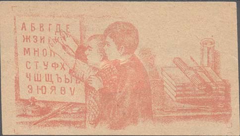 1917 1917 г. 28.10.1917 г. Разм. 80 х 46 мм. Одноцветная печать на тонкой желто-серой бумаге. В центре двое детей указывающих руками на плакат с русским алфавитом. Внизу чернильница с пером. Справа стол с книгами.