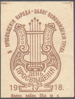 1918 1918 г. 24.-25.04.1918 г. Разм. 42 х 56 мм. Одноцветная печать на плотной желтоватой бумаге. В центре в декоративной рамке в виде лиры внизу текст в четыре строки: «День просвещения 24-25 IV 1918». Сверху полукругом текст: «В просвещении народа – залог освобождения труда». Внизу текст: «Яросл[авский]. Район Сев[ерной]. Ж. Д.».