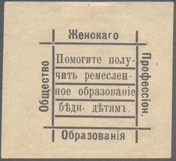 1917 1917(?) г. Разм. 56 х 52 мм. Одноцветная печать на тонкой желтоватой бумаге. В центре в прямоугольной рамке разм. 28,5 х 28,5 мм текст в четыре строки: «Помогите получить ремесленное образование бедн[ым]. детям». По внешнему пери-метру текст: «Общество Женского Професси-он[ального]. Образования».