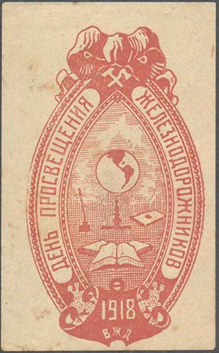 1918 1918 г. Разм. рис. 42 х 75 мм. Одноцветная печать на желтоватой бумаге. В центре в рамке сложной формы глобус, чернильница с пером, тетради и книги. Сверху железнодорожная эмблема. Внизу на картуше текст в две строки: «1918 В.Ж.Д.». По периметру рамки текст: «День просвещения железнодорожников».