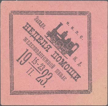 1923 1923 г. 15-23.11.1923 г. Ромб разм. 82 х 82 мм. Одноцветная печать на розово-серой бумаге. В тройной рамке в форме ромба разм. 64 х 64 мм в центре текст в три строки: «Неделя помощи железнодорожной школе». Сверху трехосный паровоз и текст в две строки: «Н.К.П.С. Западн[ая]. Ж.Д.». Внизу крупным шрифтом дата: «19 15-23/II. 23».