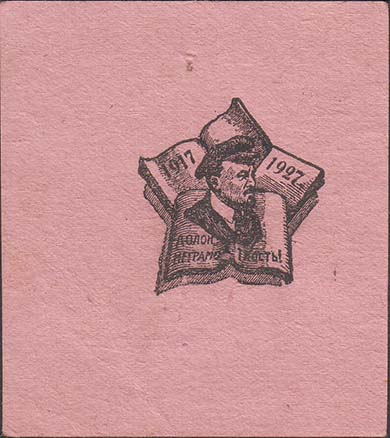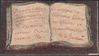 1925 1925(?) г. Разм. 53 х 30 мм. Двухцветная печать на тонкой белой бумаге. В центре на сплошном фоне раскрытая книга, на страницах которой текст в пять строк: «Долой неграмотность! «К десятилетию Октябрьской Революции не должно быть ни одного неграмотного! В.И.Ленин».
